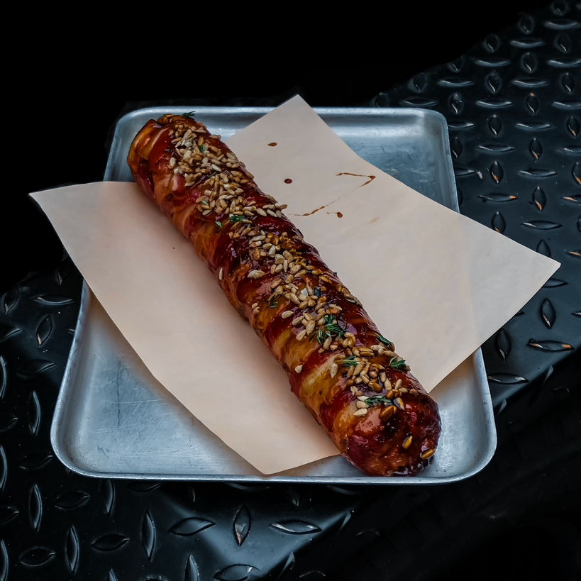 Smoked & grilled over oak. Wrapped in streaky bacon. will look & taste like the ultimate giant pig in blanket. will serve 8-10, but we wont judge if you smash it between 2 of you...
