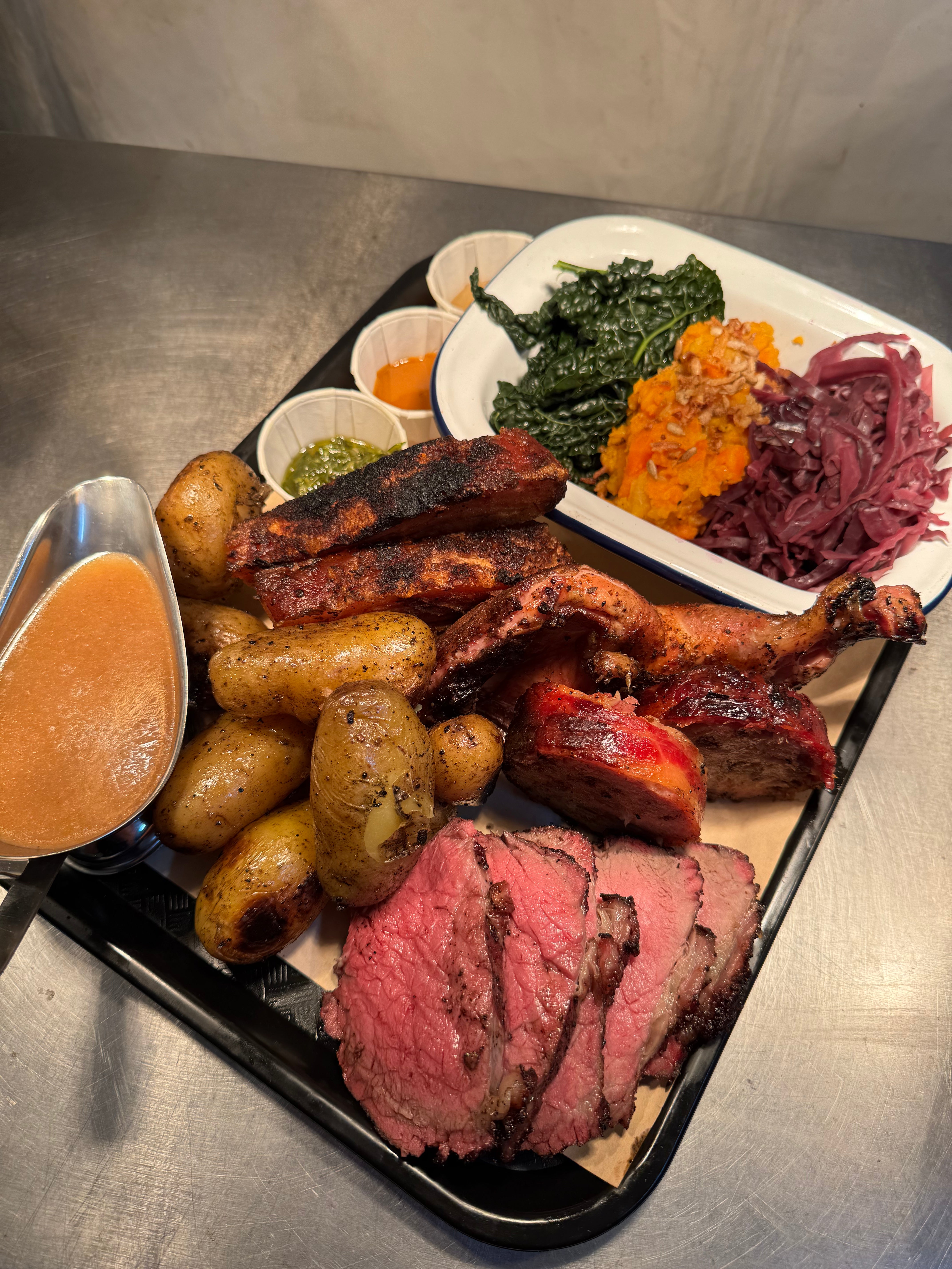 Smoked Rump of Pembrokeshire beef, wood fired pork, smoked & grilled chicken, BBQ sausage & sage stuffing, fire roasted spuds, smoked local veggies & roasted bone gravy